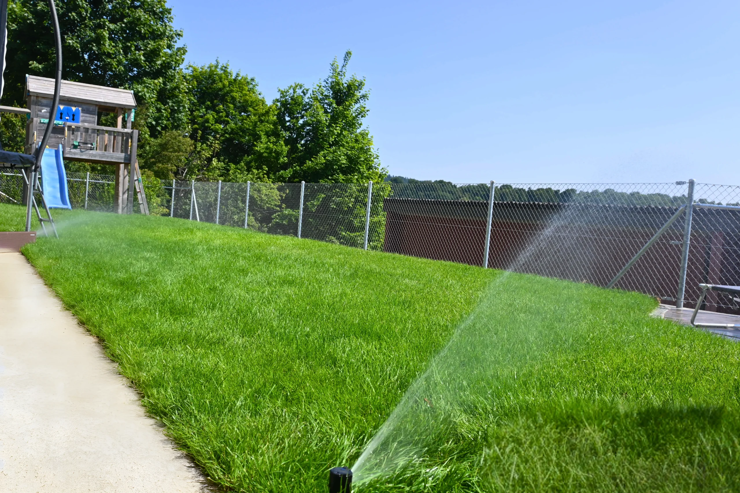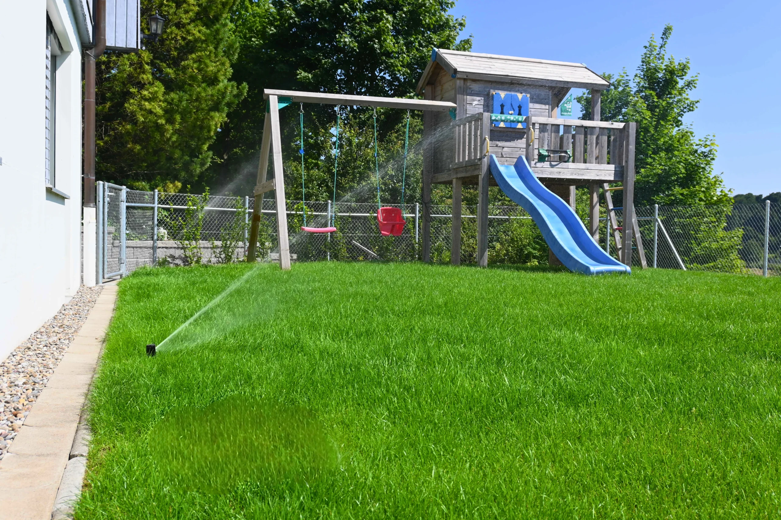 Die Bewässerung sämtlicher Flächen – vom Rasen bis zu den Pflanzbeeten – erfolgt über ein modernes, appgesteuertes System. Unsichtbar im Boden integrierte Rasensprenger sorgen für effiziente Pflege mit minimalem Aufwand. Zusätzliche Wasseranschlüsse erhöhen den praktischen Nutzen im Alltag.