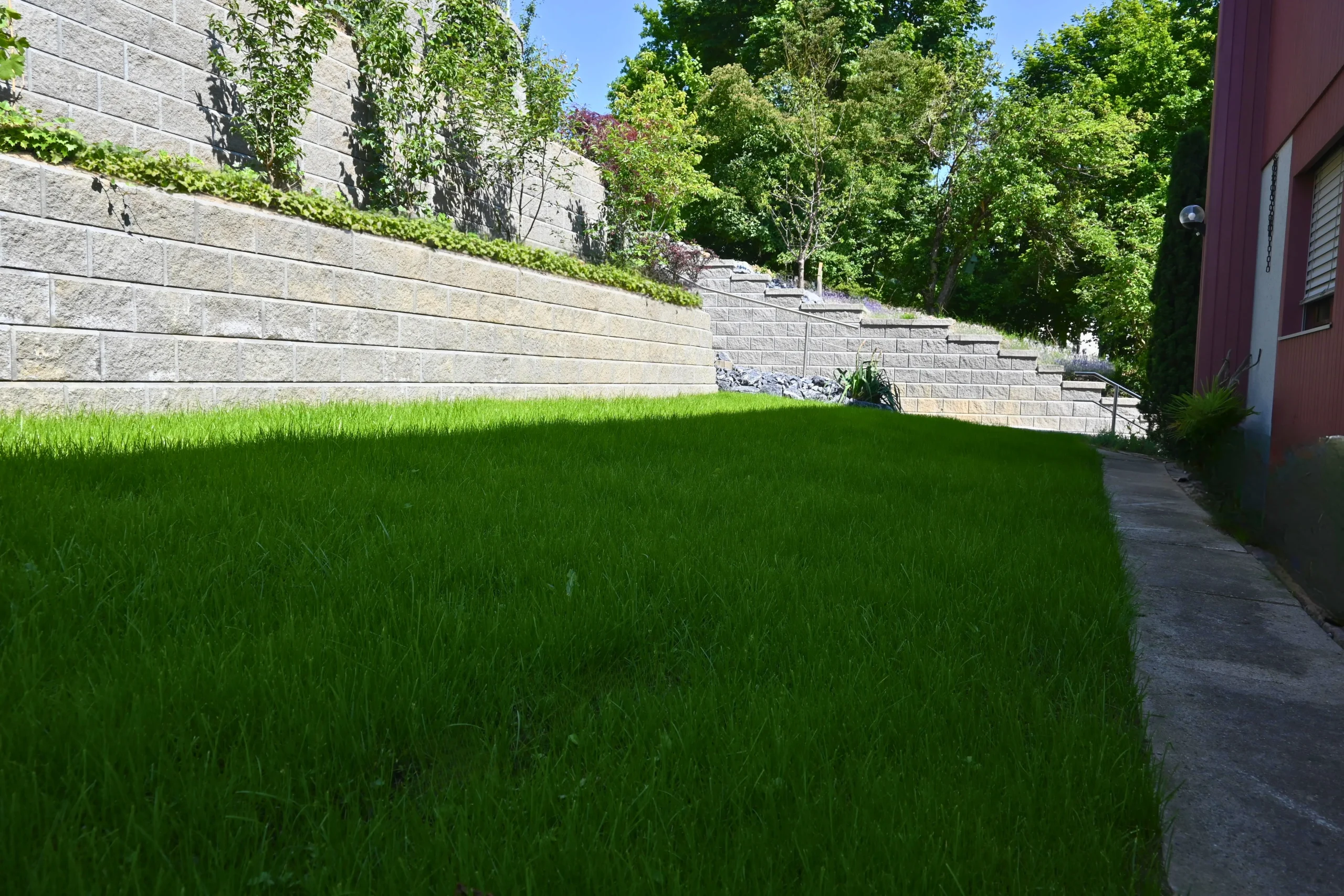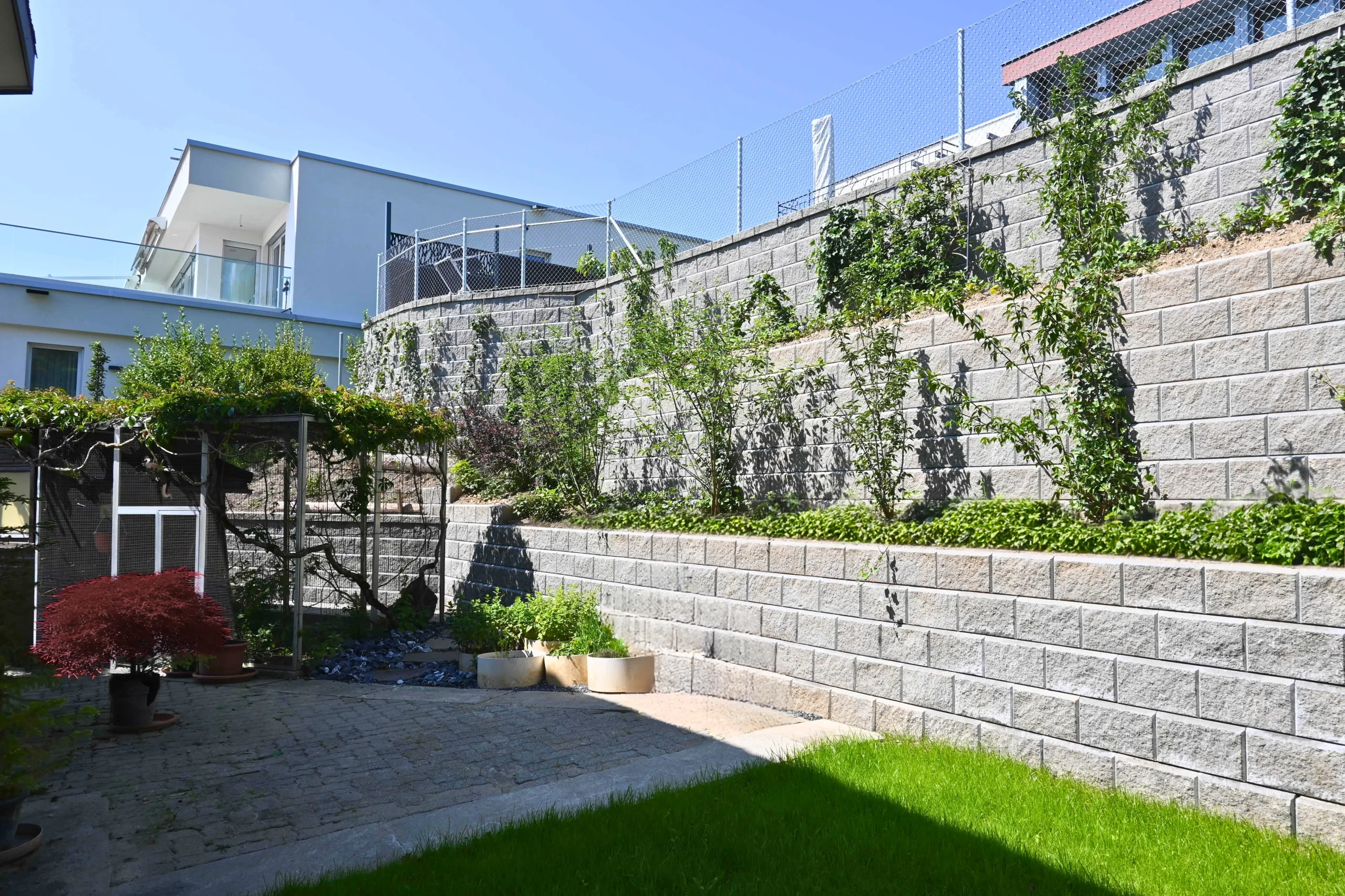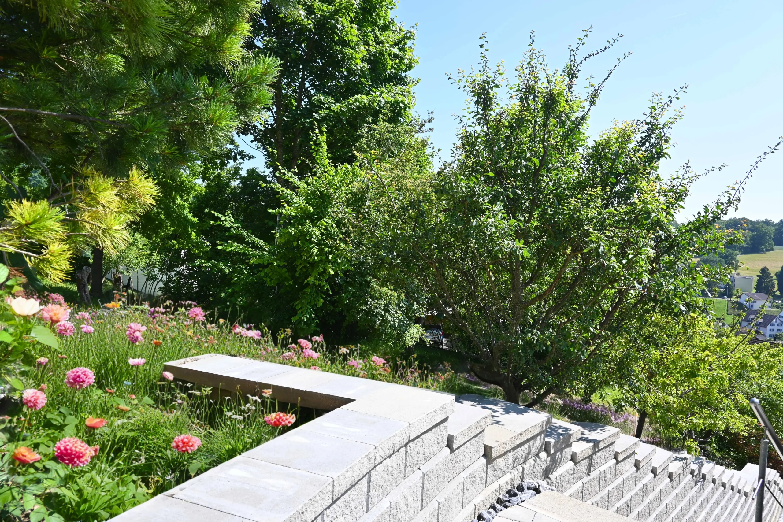 Auch angrenzende Bereiche wurden harmonisch eingebunden: Die Treppe zu den Nachbarhäusern wurde neu gesetzt, eine zusätzliche Stützmauer sichert die seitliche Böschung und eine Blumenwiese bringt ökologische Vielfalt ins Spiel. Bei den unteren Nachbarn wurde zudem ein neuer Rasen angelegt, der das Gesamtbild abrundet.