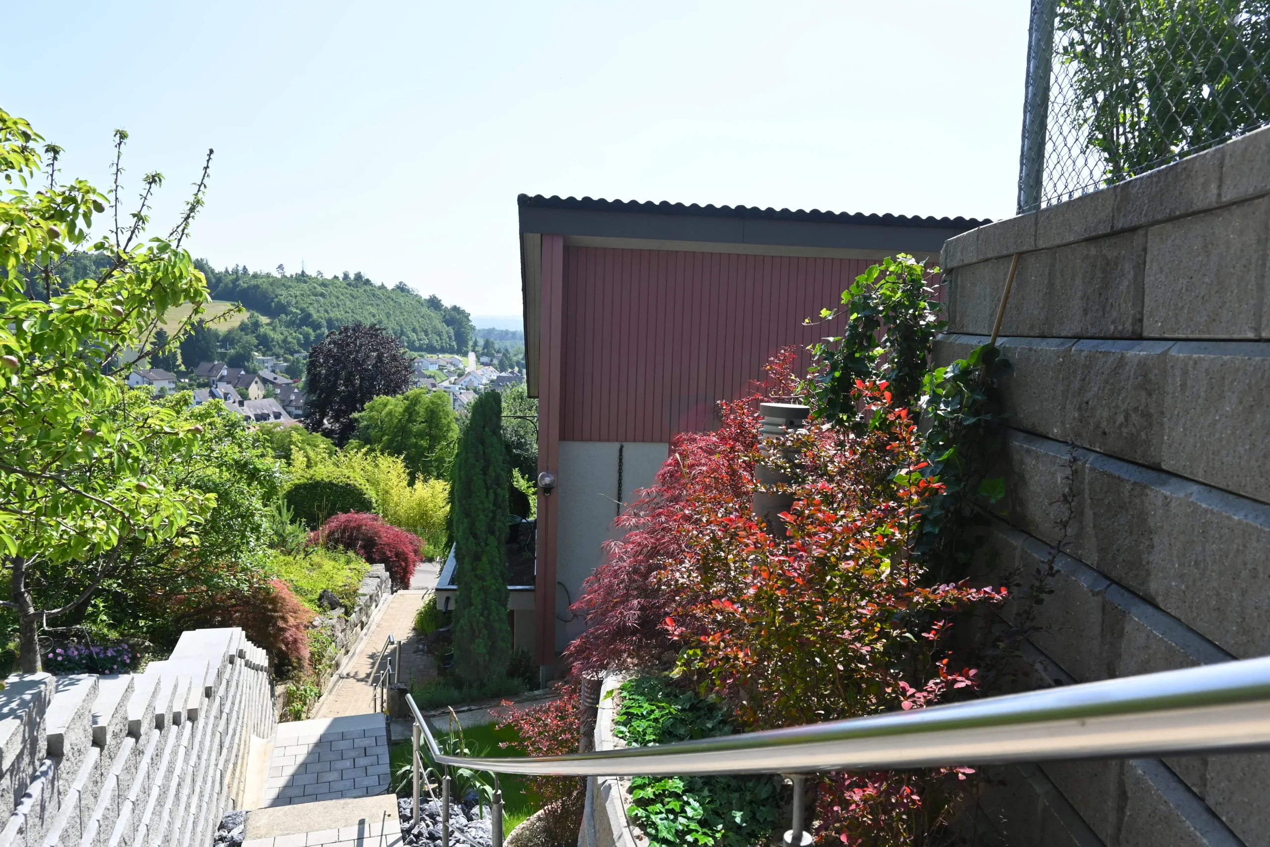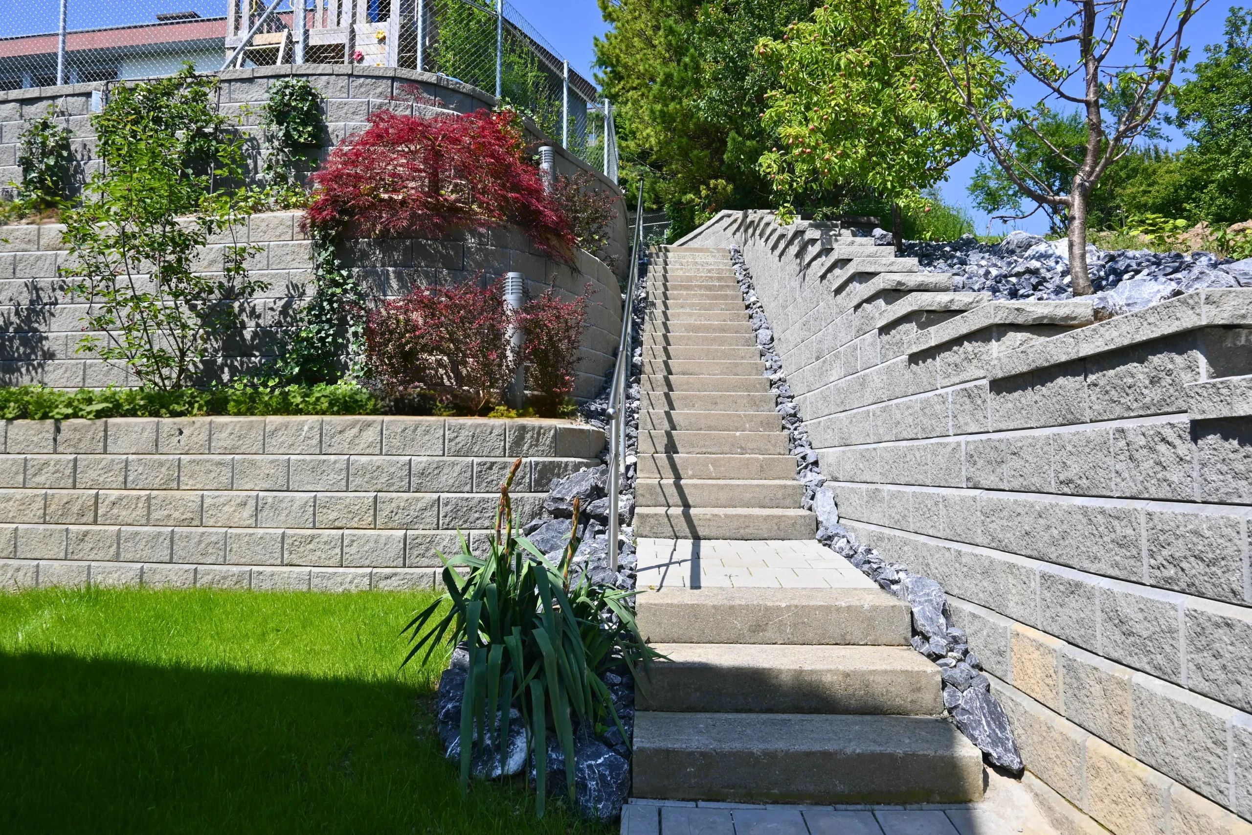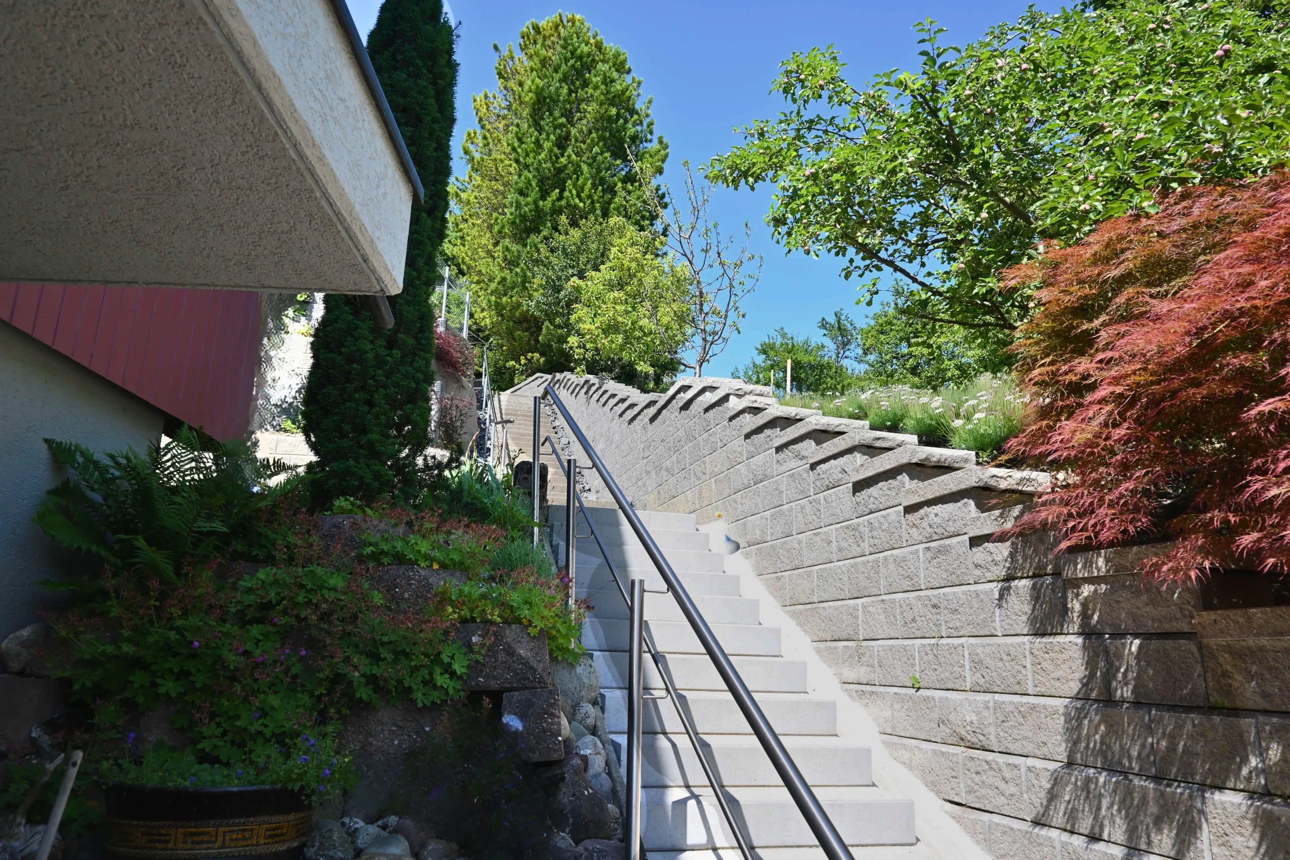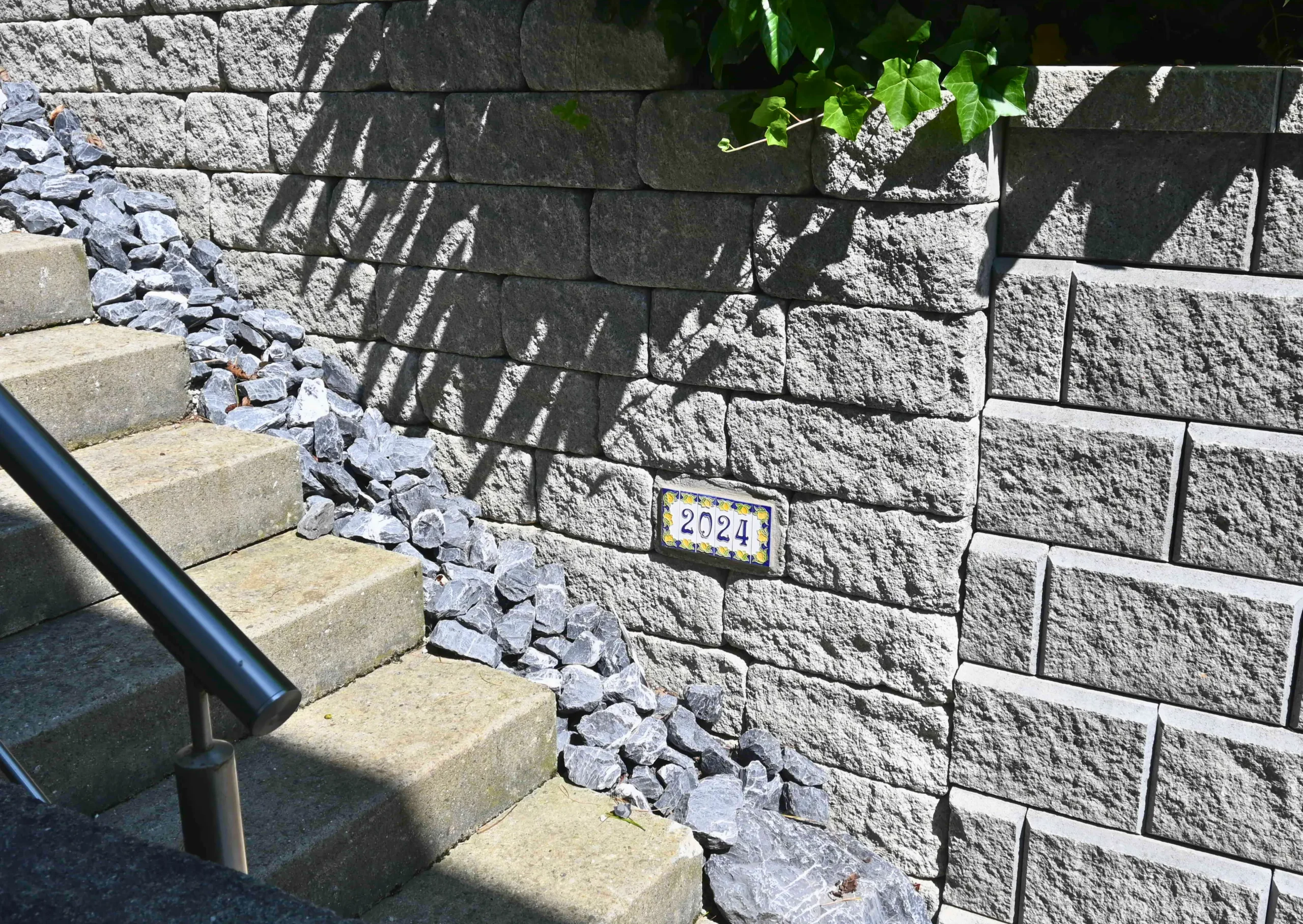 Auch angrenzende Bereiche wurden harmonisch eingebunden: Die Treppe zu den Nachbarhäusern wurde neu gesetzt, eine zusätzliche Stützmauer sichert die seitliche Böschung und eine Blumenwiese bringt ökologische Vielfalt ins Spiel. Bei den unteren Nachbarn wurde zudem ein neuer Rasen angelegt, der das Gesamtbild abrundet.