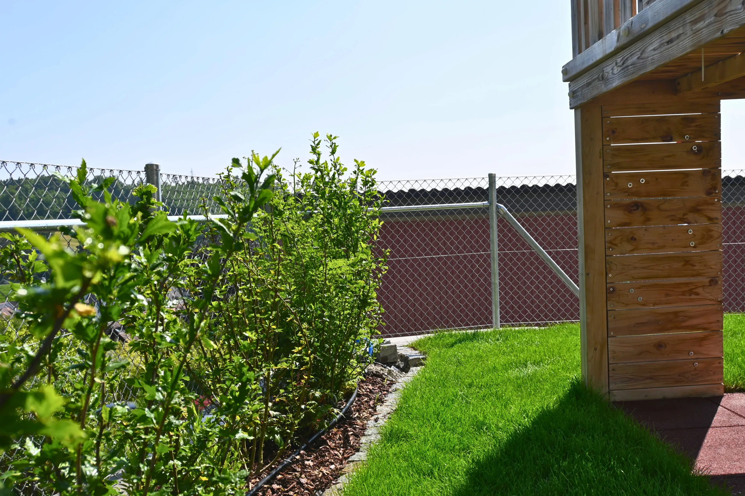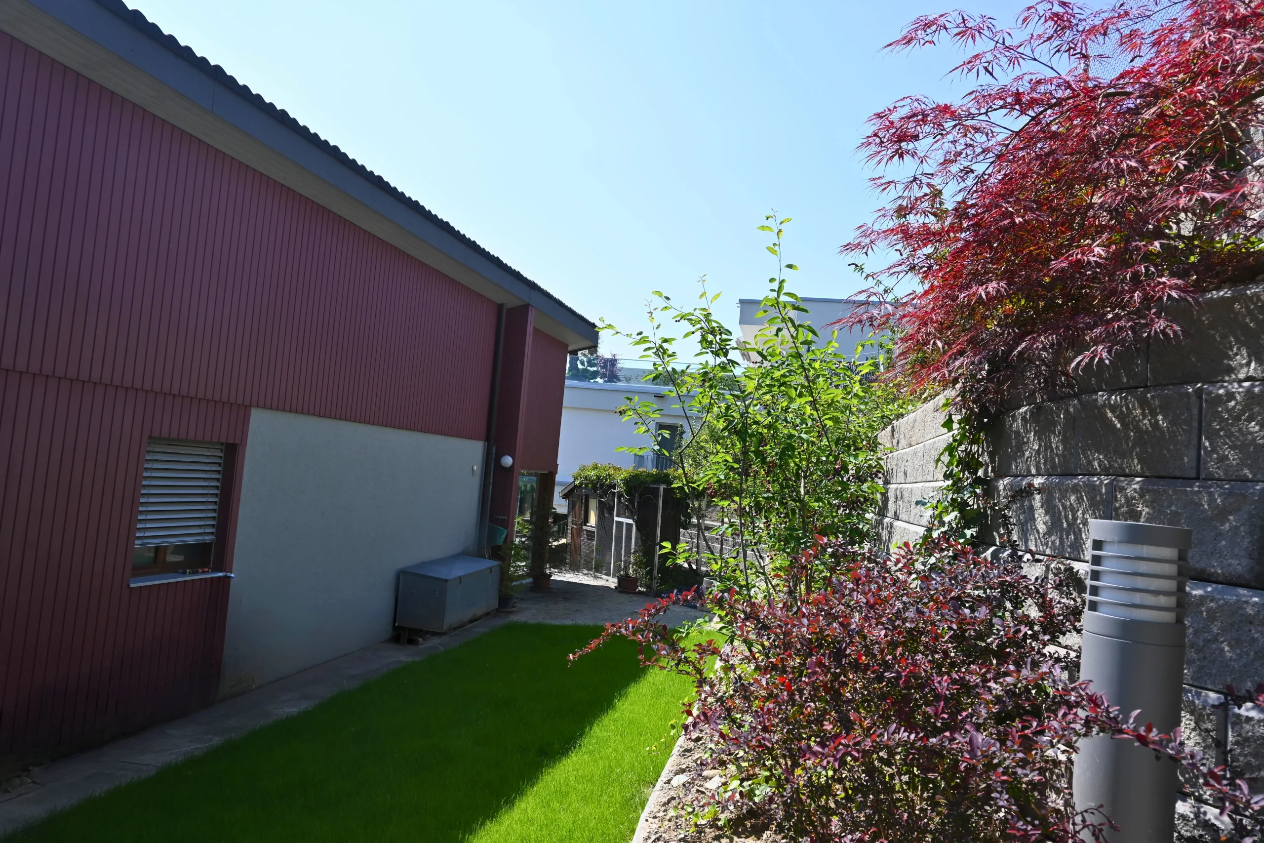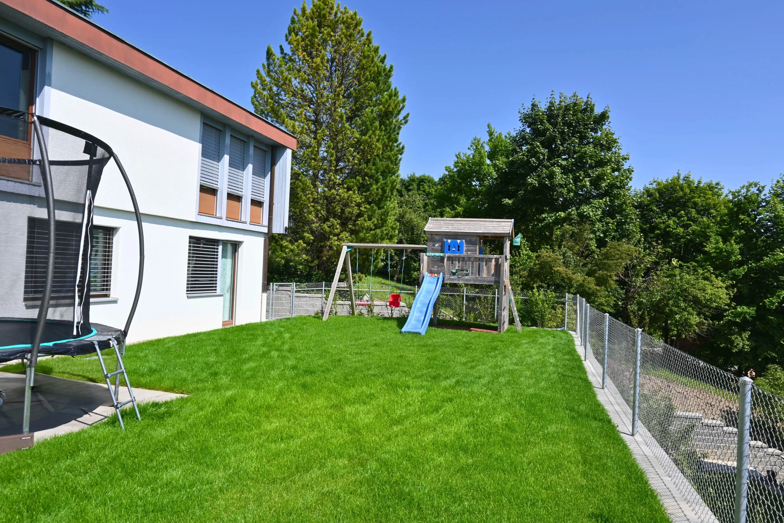 Auf der obersten Ebenen wurden zwei Sitzplätze geschaffen, die zum Verweilen einladen. Ein grosszügiger Rollrasen bringt Frische und Offenheit ins Bild, während ein Spielturm den Aussenraum auch für Kinder attraktiv macht. Die Böschung wurde mit Kletterhortensien, Ahornen, Berberitzen, Kupferfelsenbirnen und Efeu abwechslungsreich bepflanzt und bietet nun das ganze Jahr über Struktur und Farbe.