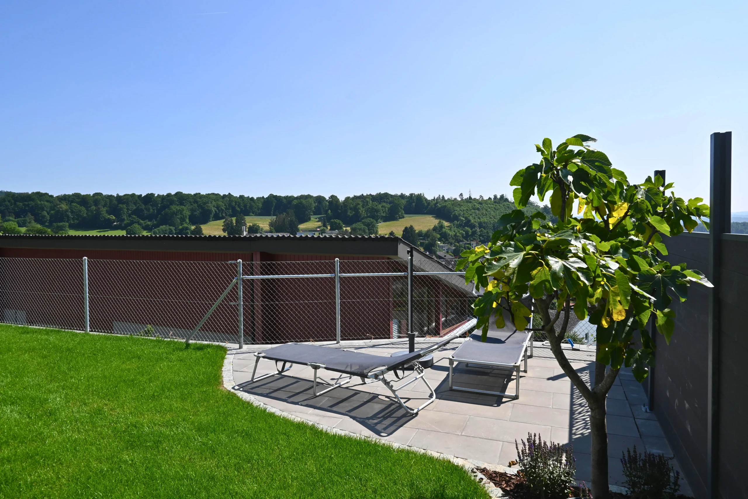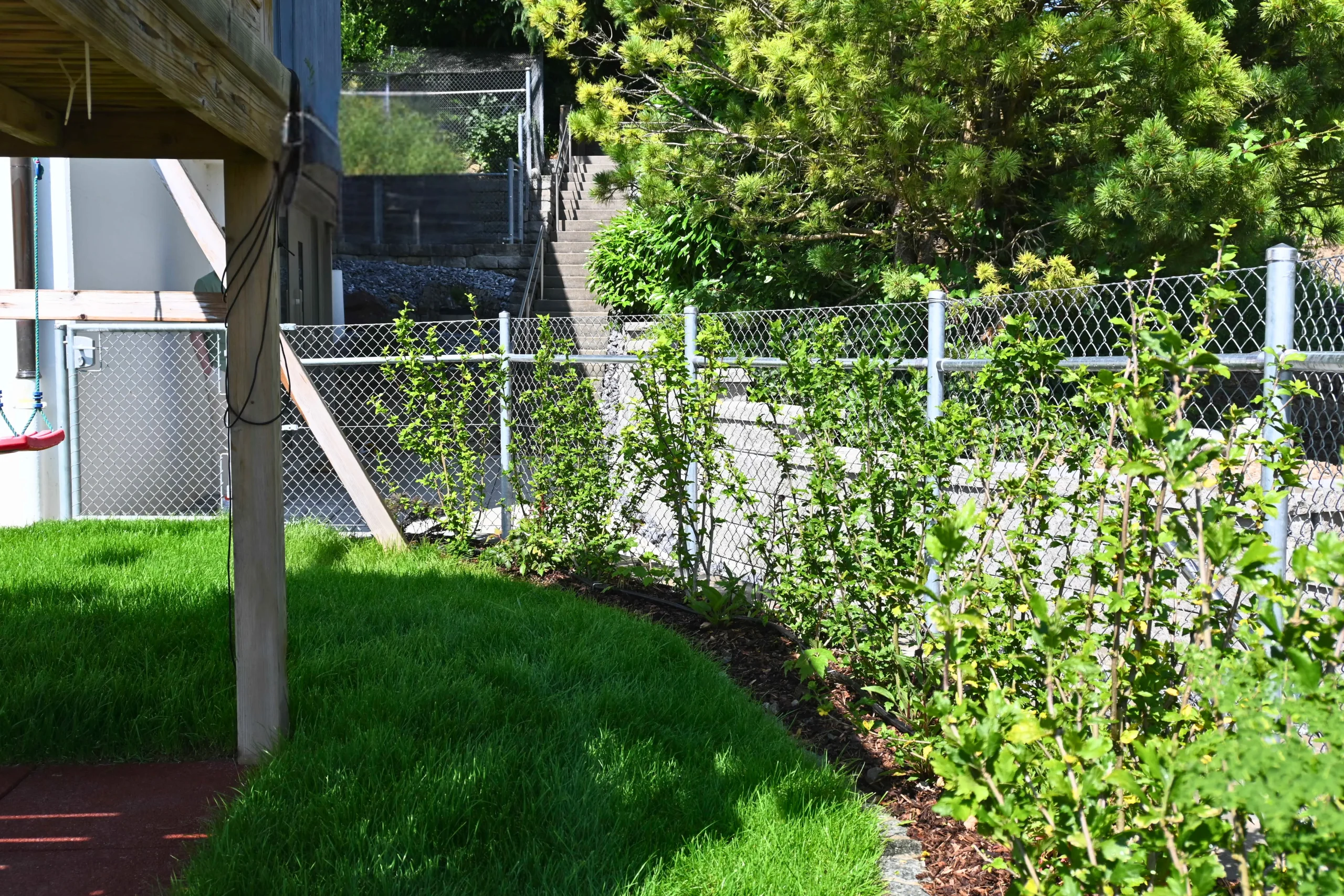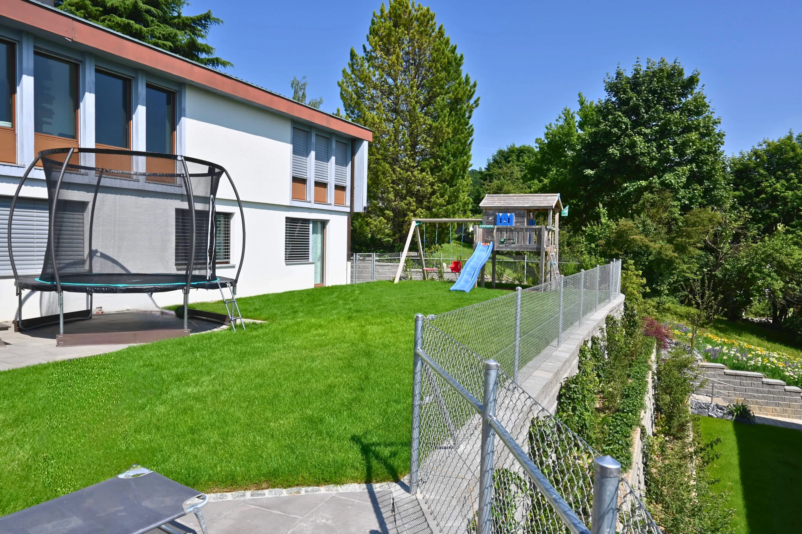 Auf der obersten Ebenen wurden zwei Sitzplätze geschaffen, die zum Verweilen einladen. Ein grosszügiger Rollrasen bringt Frische und Offenheit ins Bild, während ein Spielturm den Aussenraum auch für Kinder attraktiv macht. Die Böschung wurde mit Kletterhortensien, Ahornen, Berberitzen, Kupferfelsenbirnen und Efeu abwechslungsreich bepflanzt und bietet nun das ganze Jahr über Struktur und Farbe.
