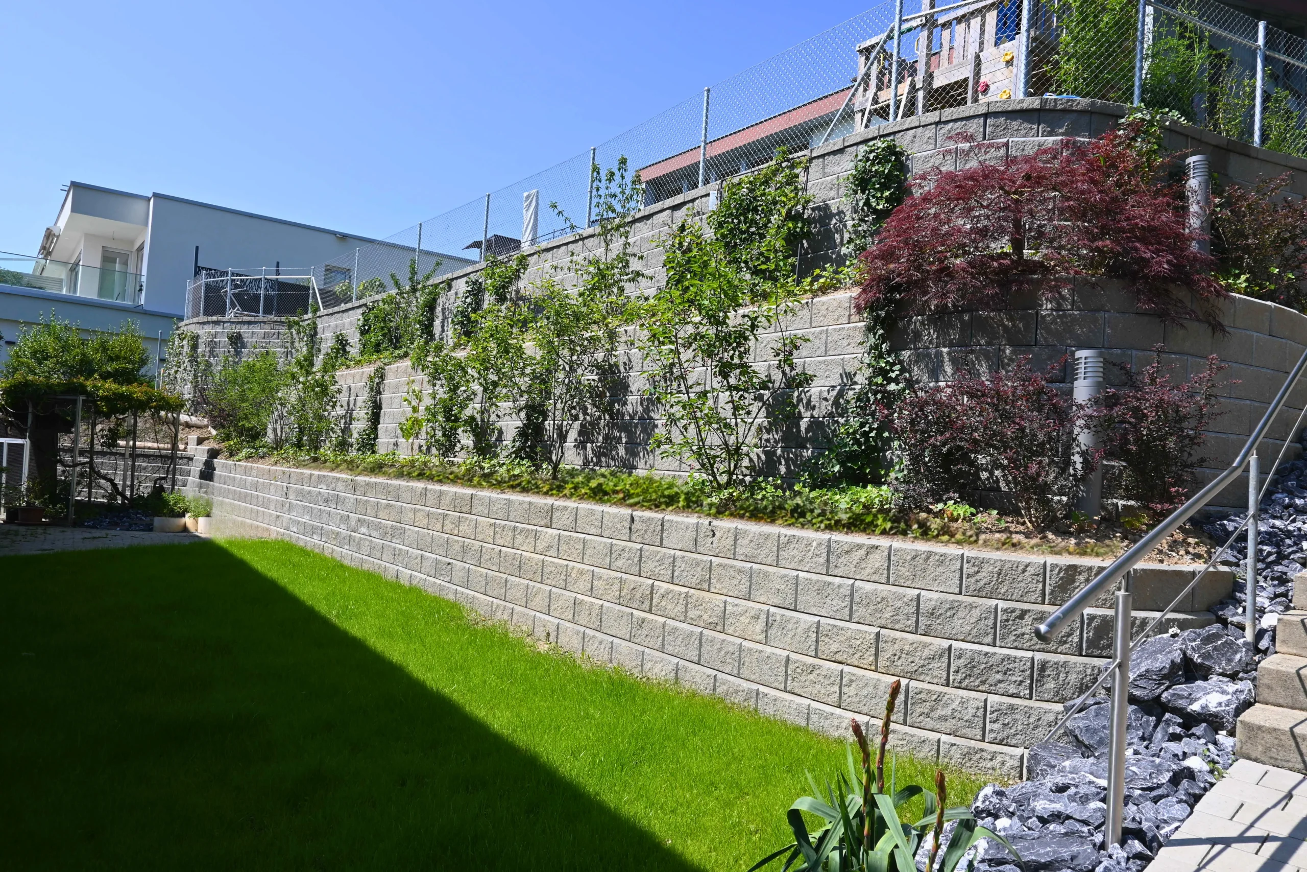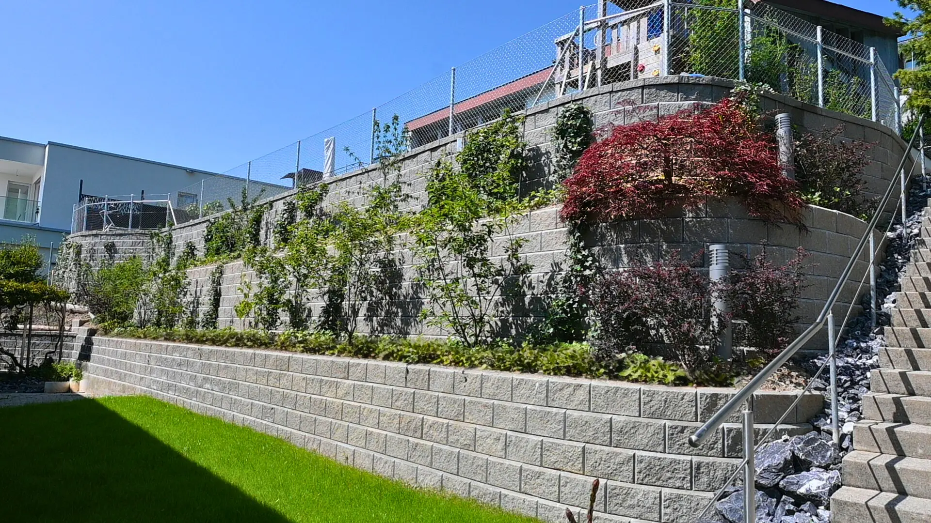 Ein Gartenprojekt mit Weitblick: In drei Etappen entstand ein strukturierter Aussenraum, der Hanglage in wertvollen Lebensraum verwandelt und Lebensqualität neu definiert. Das Herzstück bildet eine beeindruckende, dreistufige Stützmauer – 24 Meter lang und 4.5 Meter hoch – mit der die bestehende Böschung zurückgebaut und 115 m² ebene Gartenfläche gewonnen wurde.