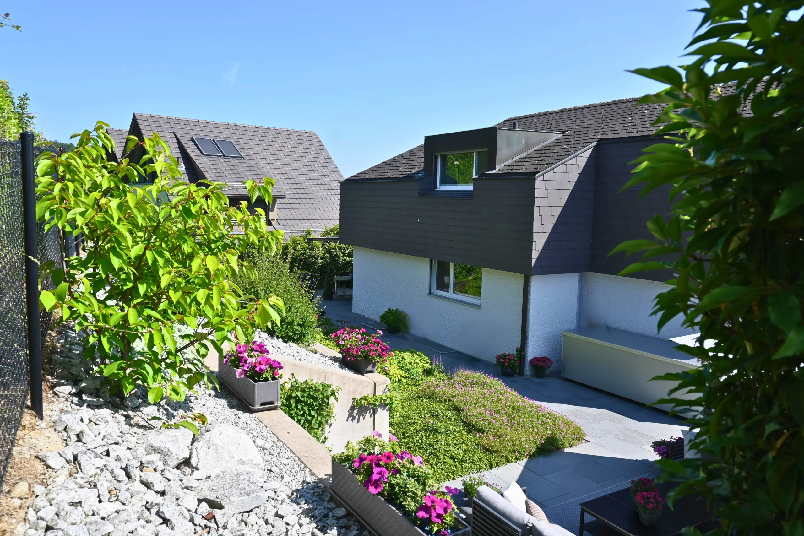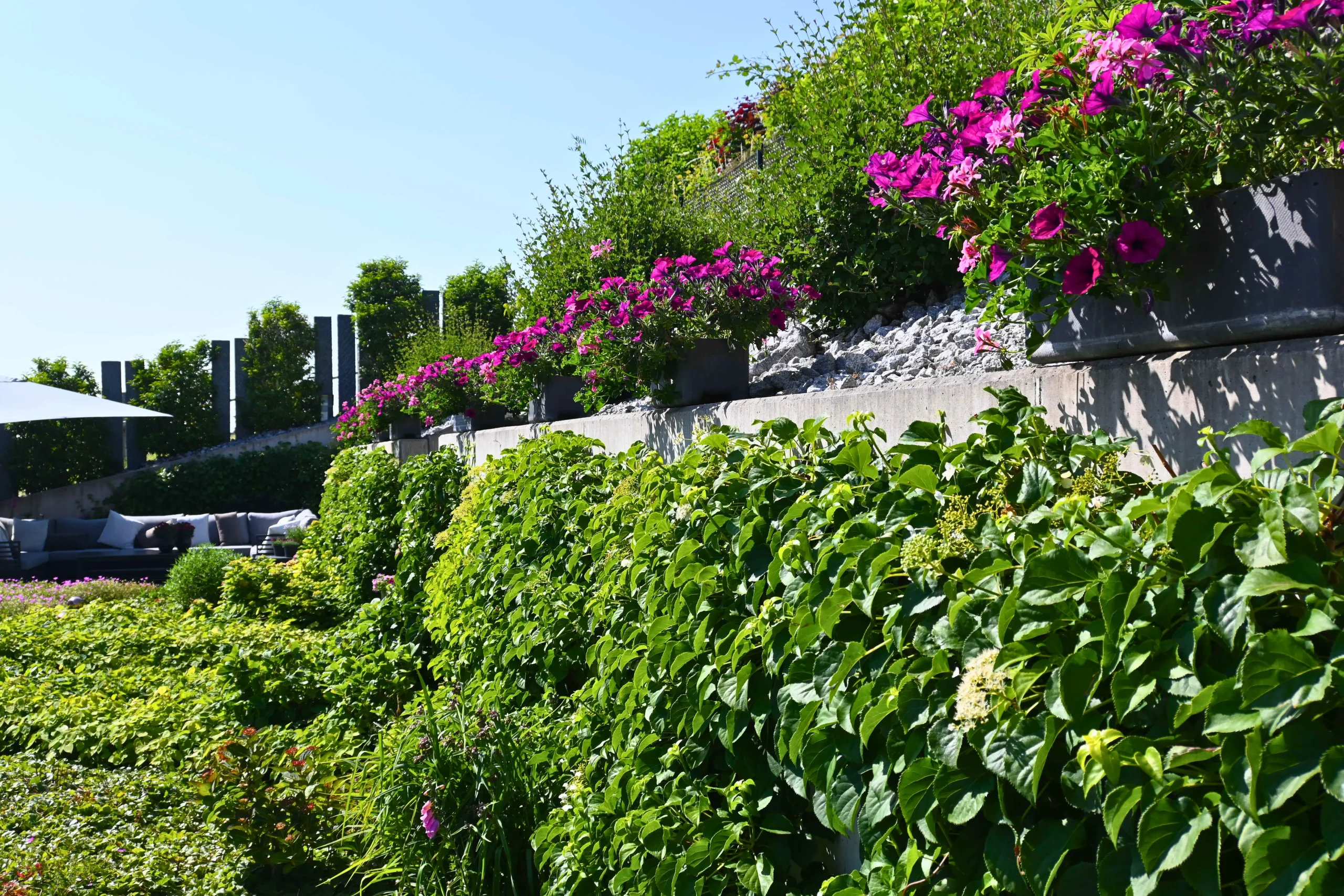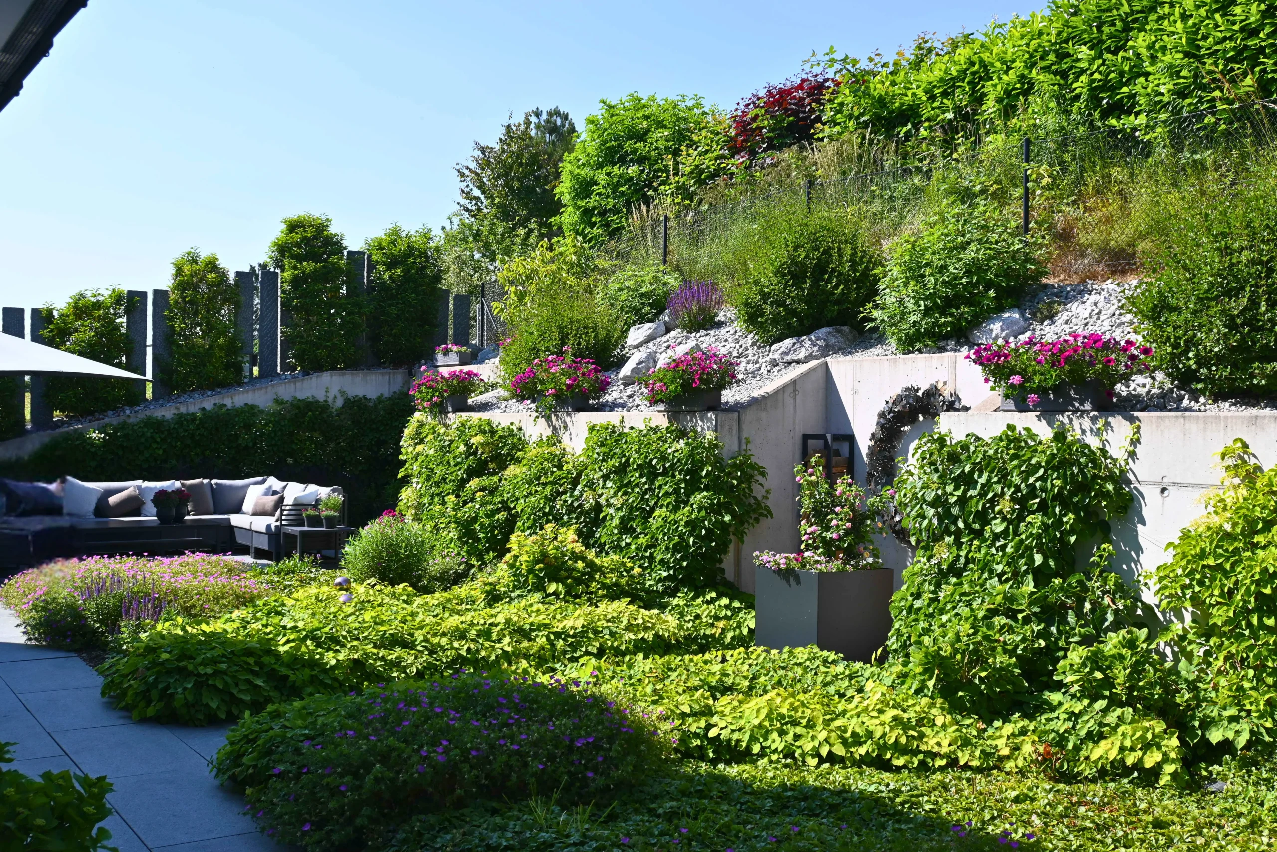 Oberhalb des Sitzplatzes entstand ein grosszügiger Steingarten, der durch seine artenreiche Bepflanzung nicht nur ein gestalterisches Highlight darstellt, sondern auch wichtigen Lebensraum für Bienen und Schmetterlinge bietet.
