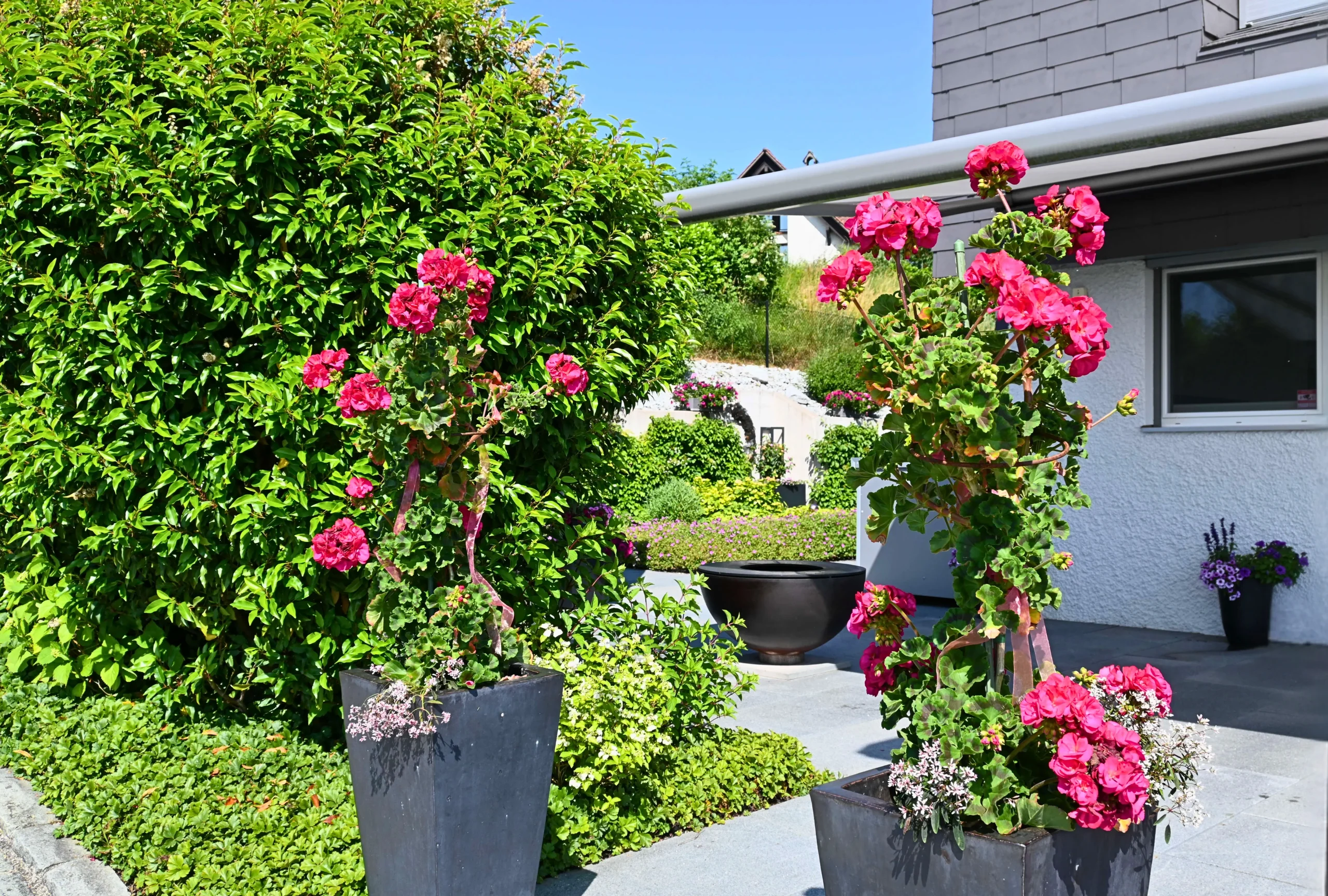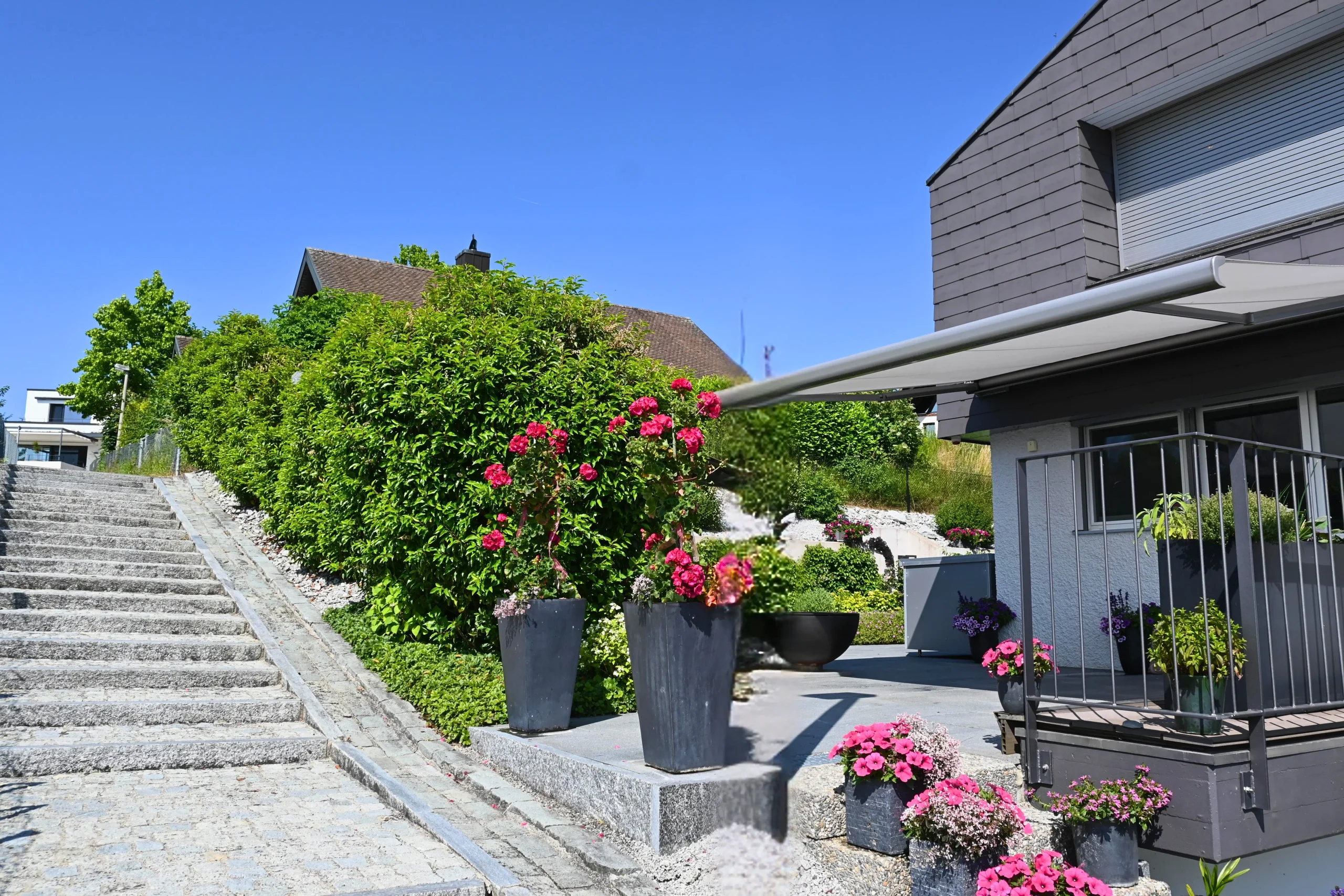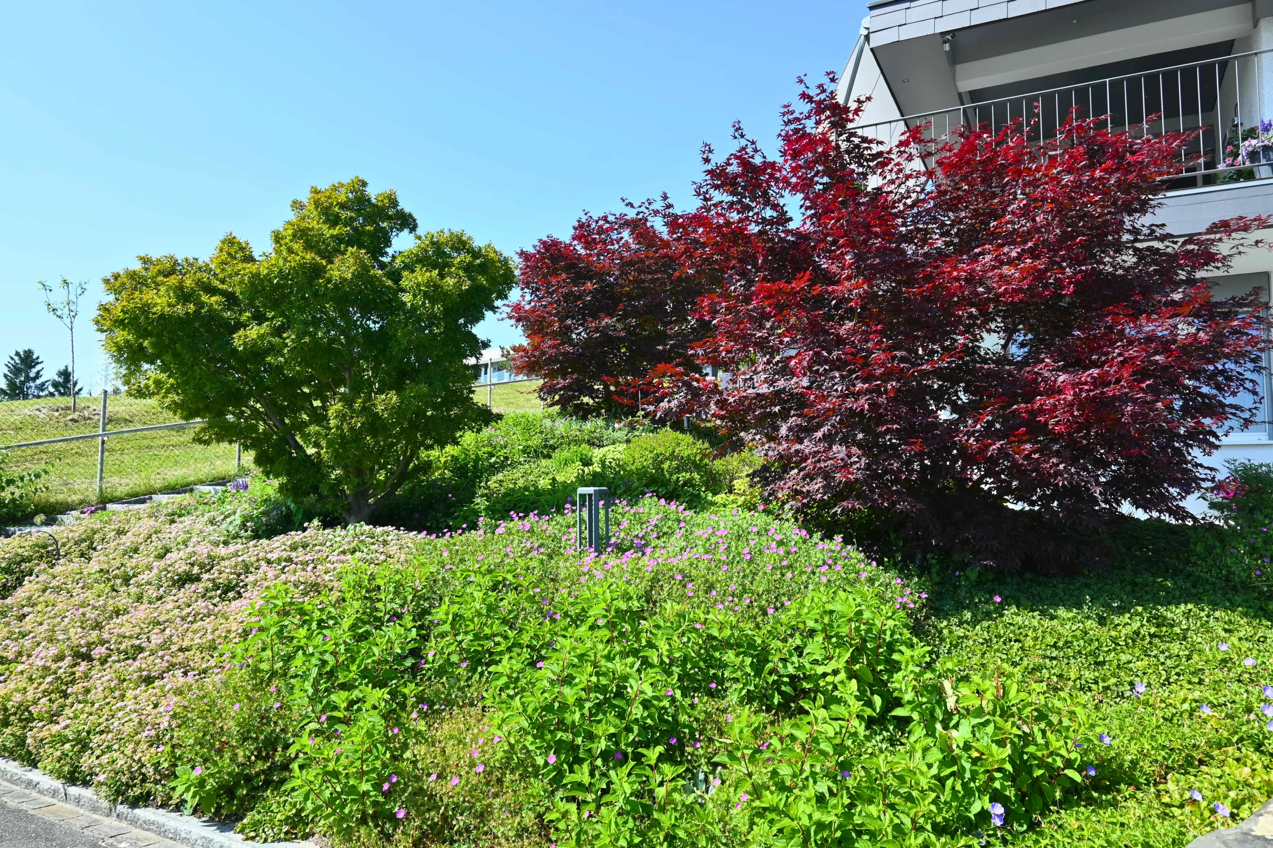 Oberhalb des Sitzplatzes entstand ein grosszügiger Steingarten, der durch seine artenreiche Bepflanzung nicht nur ein gestalterisches Highlight darstellt, sondern auch wichtigen Lebensraum für Bienen und Schmetterlinge bietet.