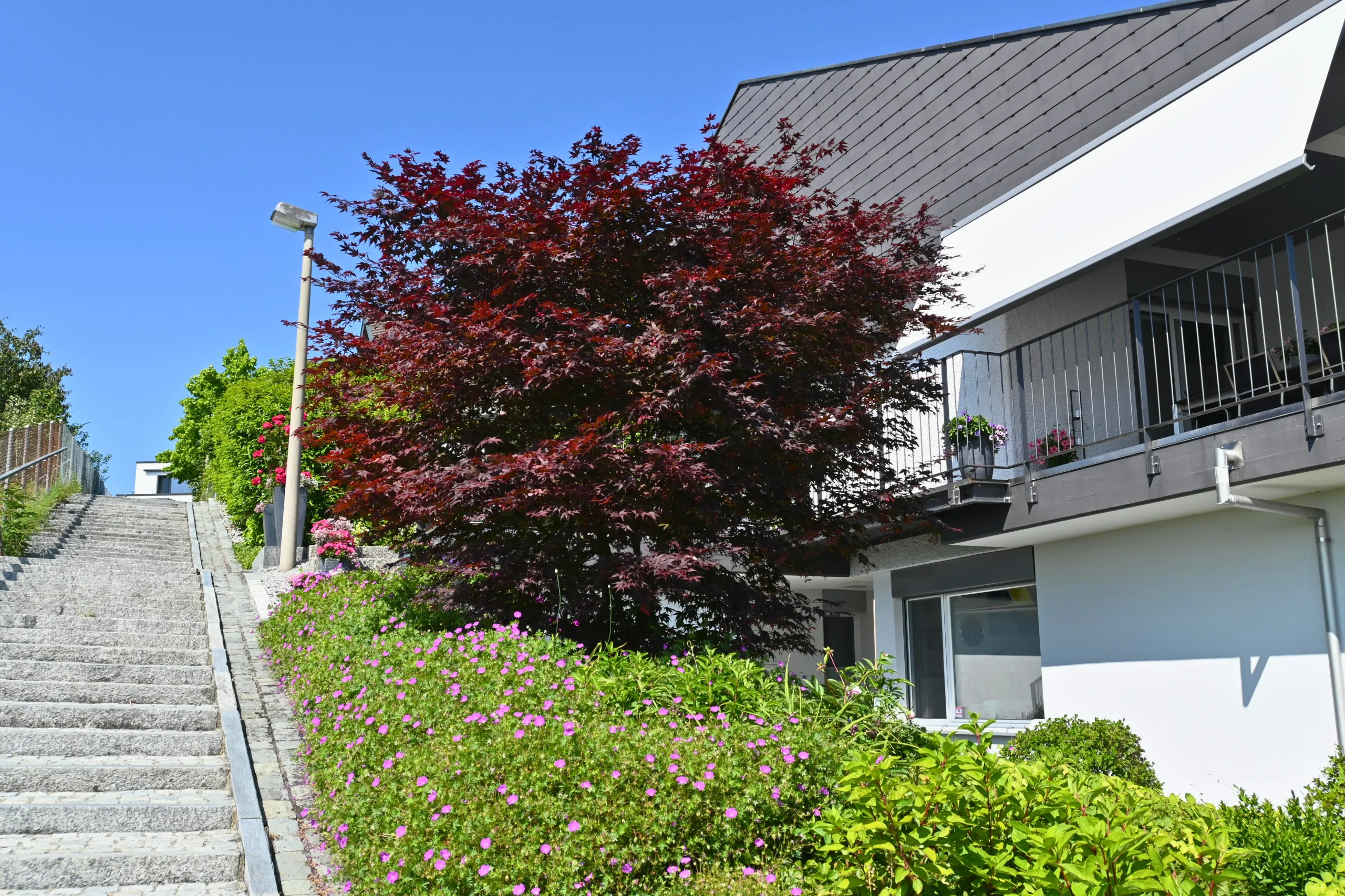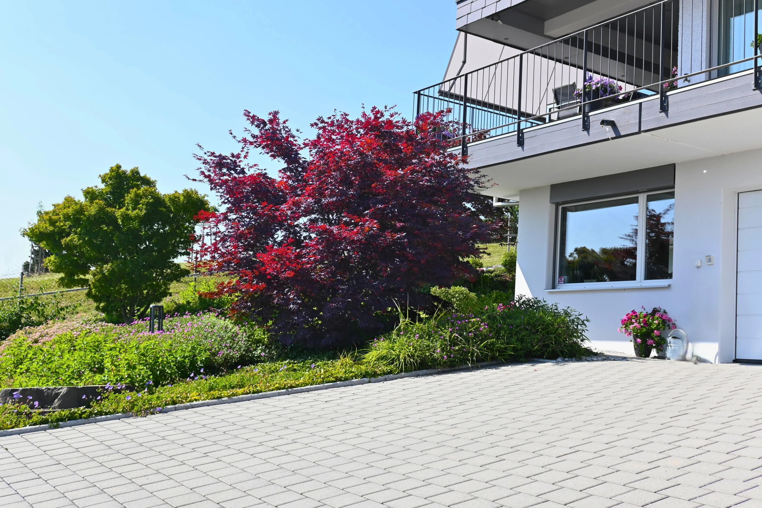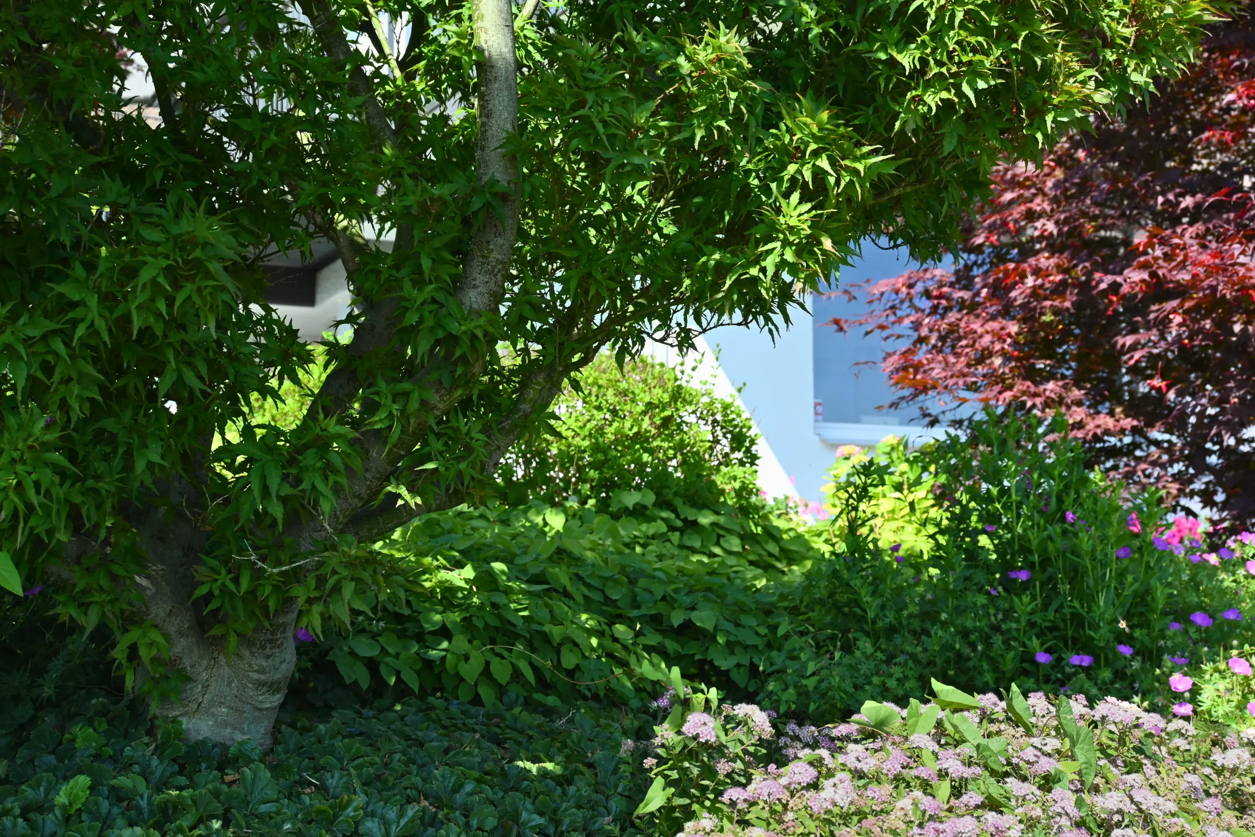 Auf einer Fläche von 140 m² wurden Samocca-Granitplatten verlegt, ergänzt durch 160 m² präzise gesetzte Verbundsteine, die Wege und Plätze definieren. Das Zentrum der Bepflanzung bilden drei markante Japanische Ahorne und ein stattlicher Cornus florida – sie geben dem Garten Struktur, Charakter und ein unverwechselbares Erscheinungsbild.